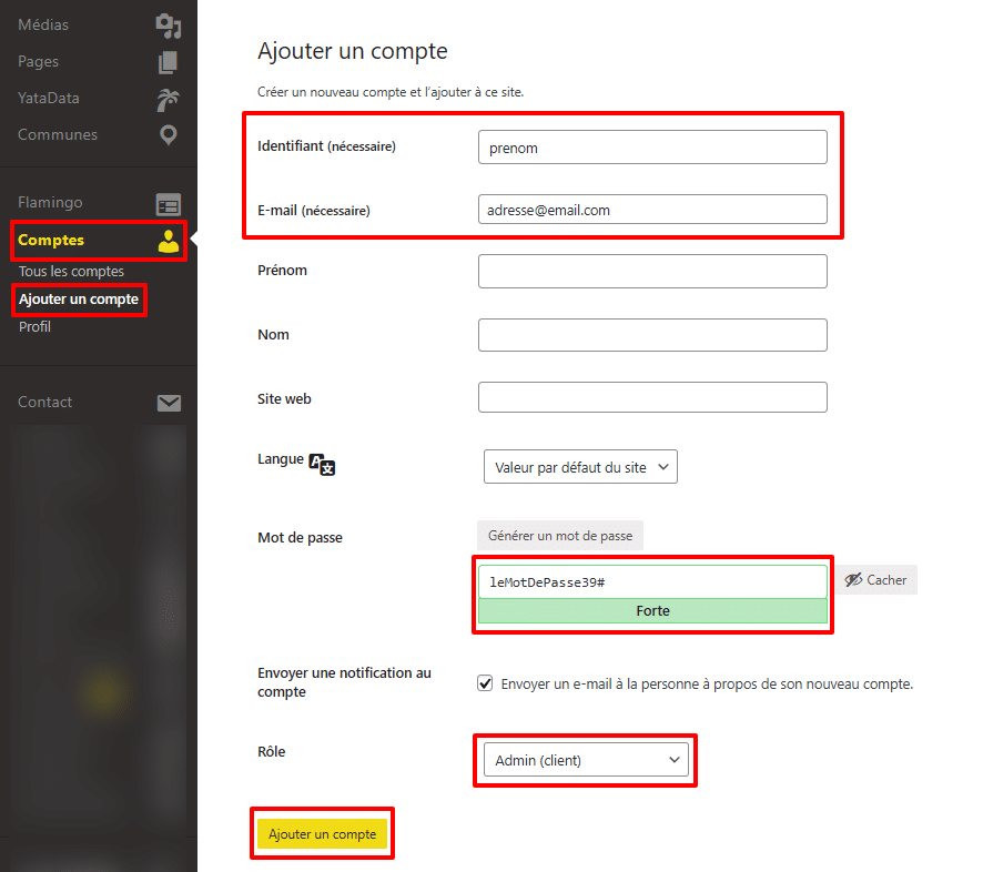 Pour créer un compte, rendez-vous dans Comptes -> Ajouter un compte. Remplissez au minimum l’identifiant, l’adresse e-mail et le mot de passe.