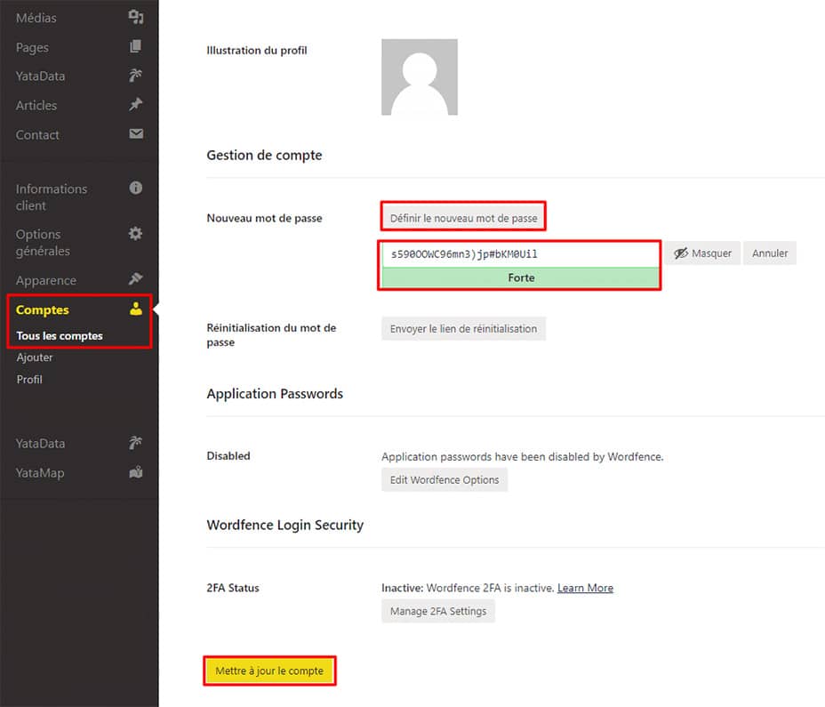 Pour cela rendez-vous sur le compte de l’utilisateur et cliquez sur le bouton « Définir le nouveau mot de passe » situé sous l’image d’avatar de l’utilisateur. N’oubliez pas de cliquer enfin sur le bouton « Mettre à jour le profil ».