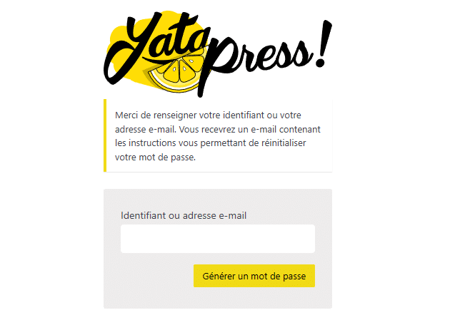 En cas de perte de votre mot de passe, vous pouvez vous rendre depuis la page de connexion sur le formulaire de réinitialisation de mot de passe (lien « Mot de passe oublié ? » ci-dessus). Indiquez simplement votre adresse e-mail et si vous avez un compte, WordPress vous enverra un e-mail vous permettant de redéfinir votre mot de passe. Vous pourrez ensuite vous connecter à votre compte avec le nouveau mot de passe défini.