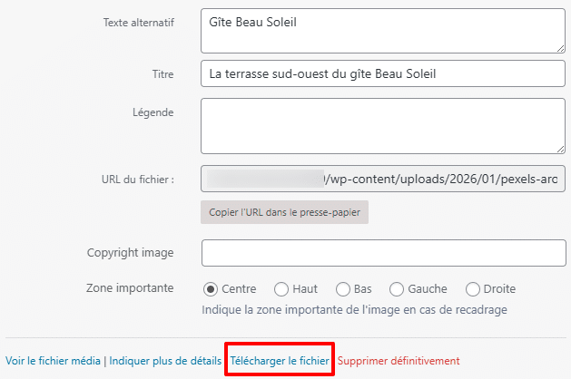 Avant toute chose, il faut avoir que la modification d’une image écrase l’image en question donc si vous souhaitez garder sur votre site l’image originale, il faudra d’abord dupliquer celle-ci. Pour cela, vous pouvez tout simplement la télécharger et la renvoyer à nouveau dans WordPress.