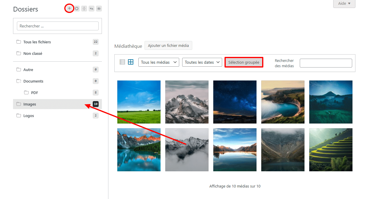 Pour catégoriser vos images, vous pouvez les glisser-déposer directement dans le dossier adéquat. Pour en ranger un grand nombre à la fois, passez en mode « Sélection groupée » puis sélectionnez toutes vos images avant de toutes les glisser-déposer en une fois. Vous pouvez ensuite désactiver le mode « Sélection groupée » en cliquant sur le bouton « Annuler ».